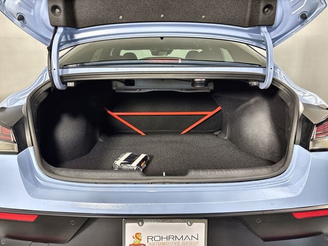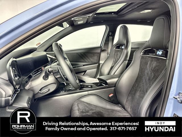 Elantra N Base is nicely equipped with Option Group 01, 4D Sedan, 2.0L 4-Cylinder Turbocharged, N 8-Speed Wet Dual Clutch, FWD, Performance Blue, Black W/Blue Stitching Leather, 4-Wheel Disc Brakes, 8 Speakers, ABS brakes, Air Conditioning, Alloy wheels, AM/FM radio: SiriusXM, Apple CarPlay & Android Auto, Auto High-beam Headlights, Automatic temperature control, Brake assist, Bumpers: body-color, Compass, Delay-off headlights, Driver door bin, Driver vanity mirror, Dual front impact airbags, Dual front side impact airbags, Electronic Stability Control, Emergency communication system: None, Exterior Parking Camera Rear, First Aid Kit, Four wheel independent suspension, Front anti-roll bar, Front Bucket Seats, Front Center Armrest w/Storage, Front dual zone A/C, Front reading lights, Fully automatic headlights, Heated door mirrors, Heated front seats, Illuminated entry, Leather Shift Knob, Leather steering wheel, Leather/Alcantara Seat Trim, Low tire pressure warning, N Light Heated Sport Bucket Seats, Navigation System, Occupant sensing airbag, Outside temperature display, Overhead airbag, Overhead console, Panic alarm, Passenger door bin, Passenger vanity mirror, Power door mirrors, Power moonroof, Power steering, Power windows, Radio: Bose AM/FM/HD/SXM Audio System, Rear Bumper Applique, Rear side impact airbag, Rear window defroster, Remote keyless entry, Security system, Speed control, Speed-sensing steering, Spoiler, Steering wheel mounted audio controls, Tachometer, Telescoping steering wheel, Tilt steering wheel, Traction control, Trip computer, Turn signal indicator mirrors, Variably intermittent wipers, and Wheels: 19 x 8.0 Forged Alloy. FWD N 8-Speed Wet Dual Clutch 2.0L 4-Cylinder Turbocharged