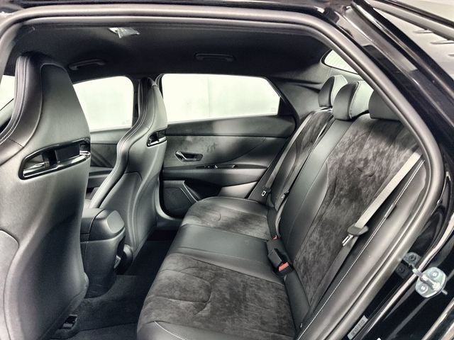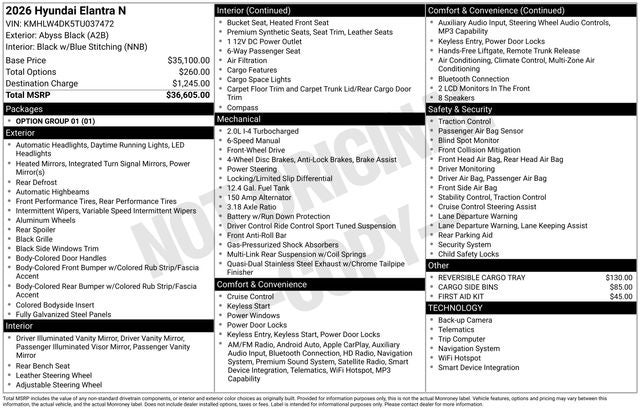 Elantra N Base is nicely equipped with Option Group 01, 4D Sedan, 2.0L 4-Cylinder Turbocharged, 6-Speed Manual, FWD, Abyss Black, Black W/Blue Stitching Leather, 4-Wheel Disc Brakes, 8 Speakers, ABS brakes, Air Conditioning, Alloy wheels, AM/FM radio: SiriusXM, Apple CarPlay & Android Auto, Auto High-beam Headlights, Automatic temperature control, Brake assist, Bumpers: body-color, Cargo Side Bins, Compass, Delay-off headlights, Driver door bin, Driver vanity mirror, Dual front impact airbags, Dual front side impact airbags, Electronic Stability Control, Exterior Parking Camera Rear, First Aid Kit, Four wheel independent suspension, Front anti-roll bar, Front Bucket Seats, Front Center Armrest w/Storage, Front dual zone A/C, Front reading lights, Fully automatic headlights, Heated door mirrors, Heated front seats, Illuminated entry, Leather Shift Knob, Leather steering wheel, Leather/Alcantara Seat Trim, Low tire pressure warning, N Light Heated Sport Bucket Seats, Navigation System, Occupant sensing airbag, Outside temperature display, Overhead airbag, Overhead console, Panic alarm, Passenger door bin, Passenger vanity mirror, Power door mirrors, Power steering, Power windows, Radio: Bose AM/FM/HD/SXM Audio System, Rear side impact airbag, Rear window defroster, Remote keyless entry, Security system, Speed control, Speed-sensing steering, Spoiler, Steering wheel mounted audio controls, Tachometer, Telescoping steering wheel, Tilt steering wheel, Traction control, Trip computer, Turn signal indicator mirrors, Variably intermittent wipers, and Wheels: 19 x 8.0 Forged Alloy. FWD 6-Speed Manual 2.0L 4-Cylinder Turbocharged