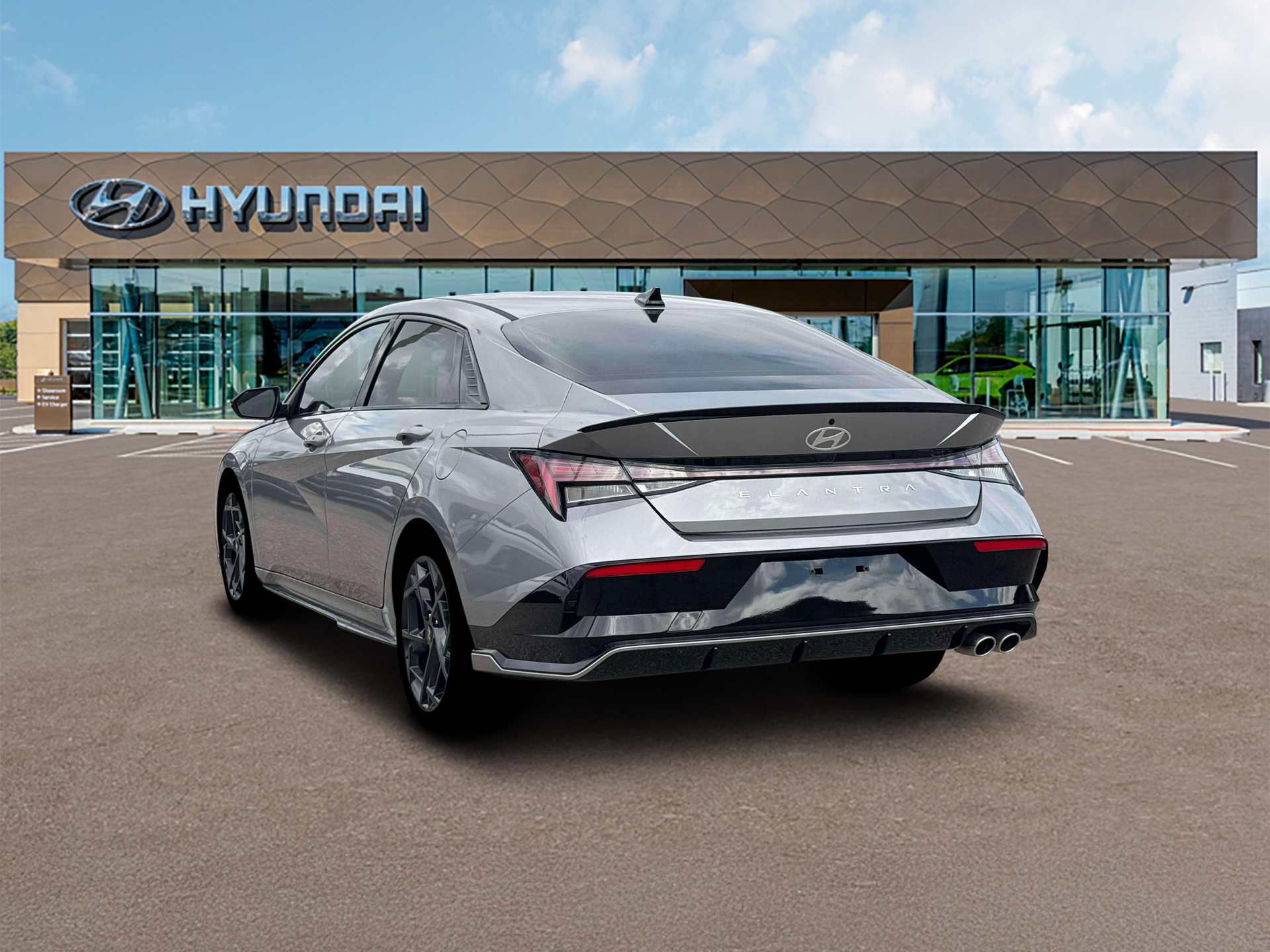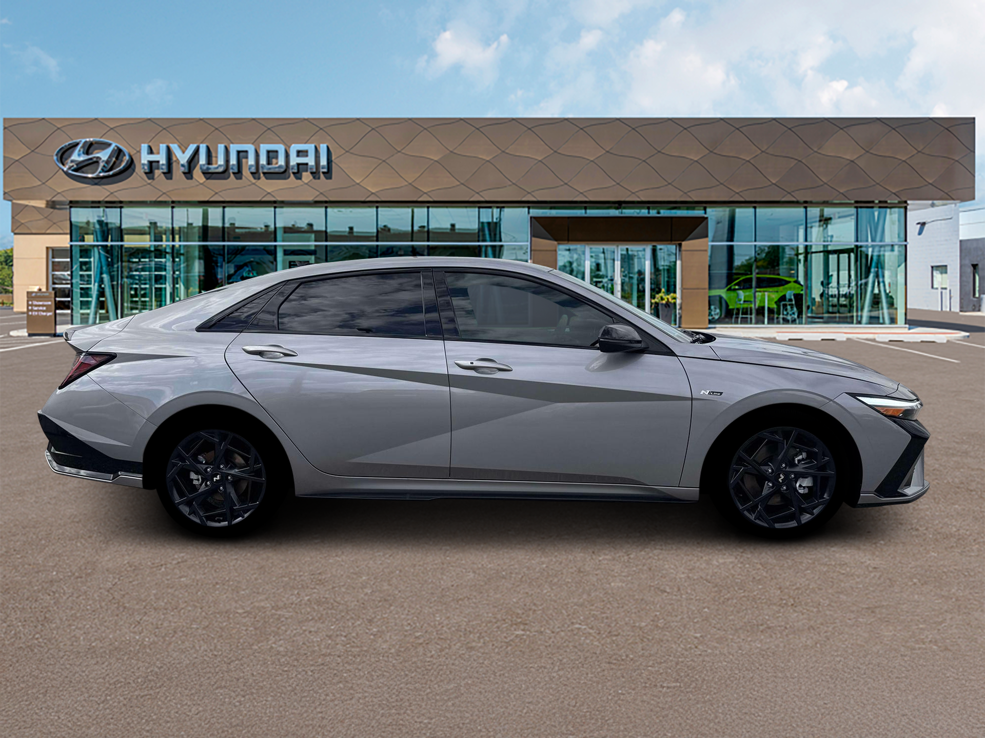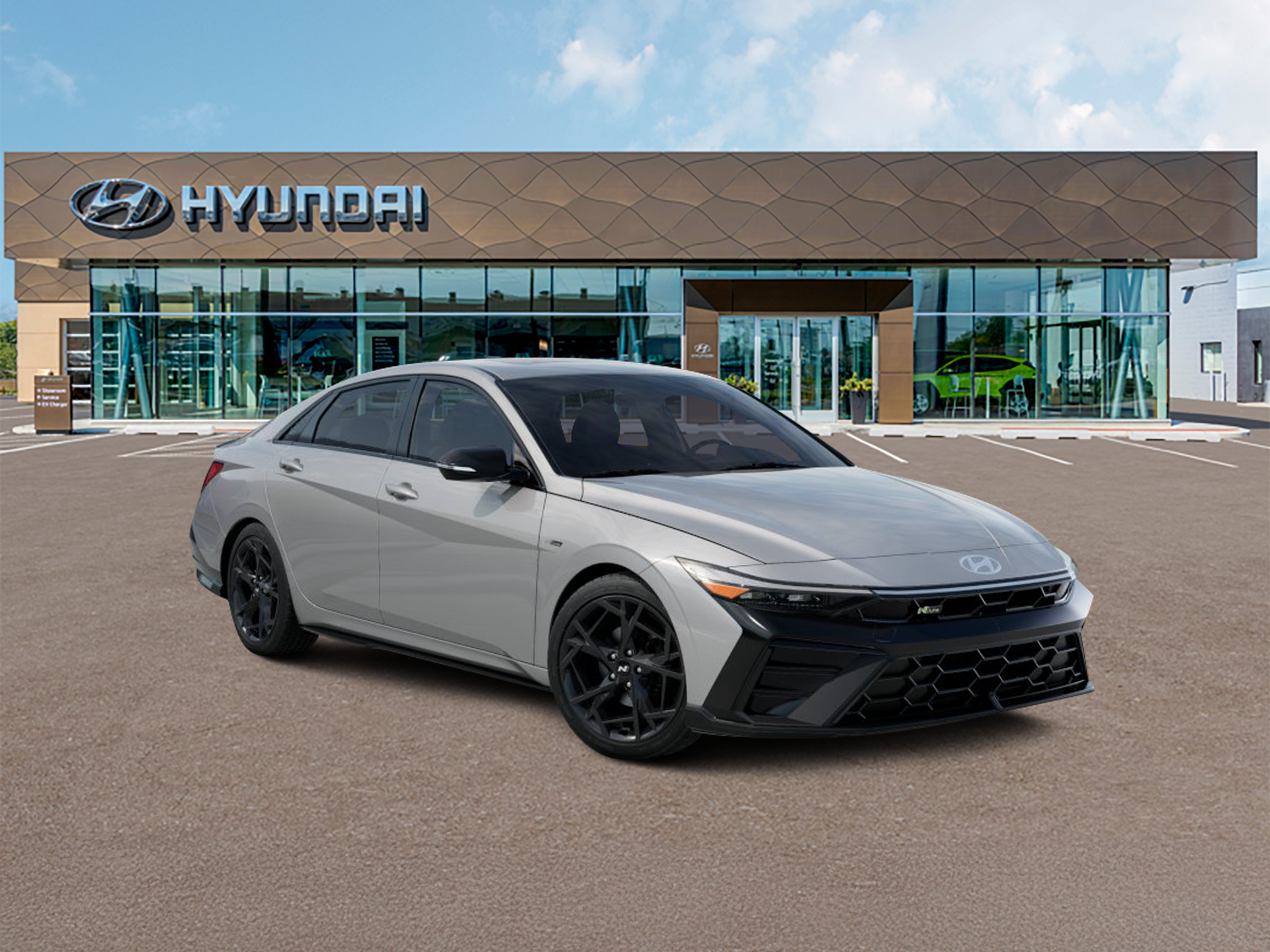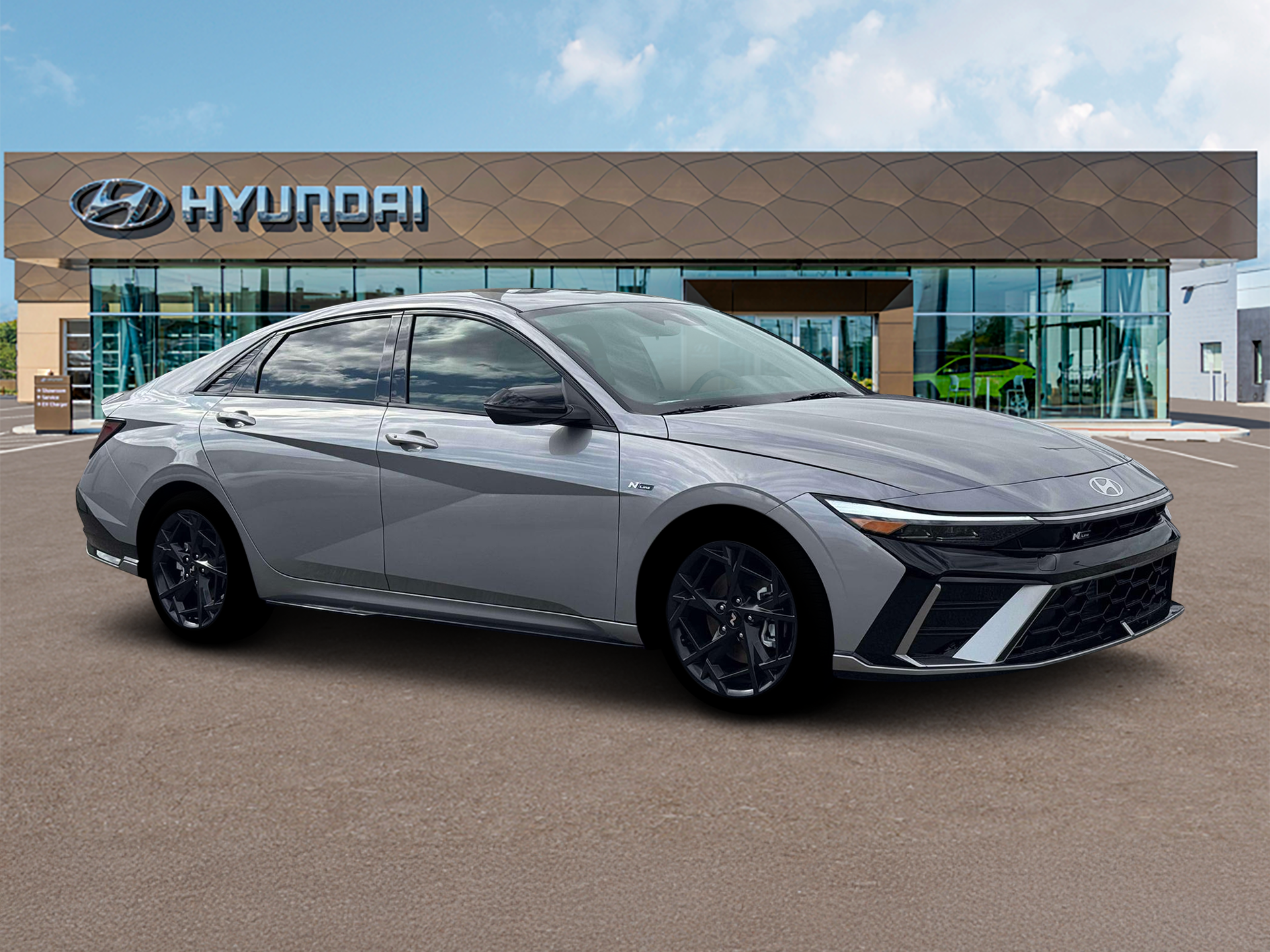 Elantra N Line is nicely equipped with Elantra N Line, 4D Sedan, I4, 7-Speed Dual Clutch DCT, FWD, Fluid Metal, Black Cloth, 4-Wheel Disc Brakes, 8 Speakers, ABS brakes, Air Conditioning, Alloy wheels, AM/FM radio: SiriusXM, Apple CarPlay & Android Auto, Auto High-beam Headlights, Automatic temperature control, Brake assist, Delay-off headlights, Driver door bin, Driver vanity mirror, Dual front impact airbags, Dual front side impact airbags, Electronic Stability Control, Exterior Parking Camera Rear, Four wheel independent suspension, Front anti-roll bar, Front Bucket Seats, Front dual zone A/C, Front reading lights, Fully automatic headlights, Heated door mirrors, Heated front seats, Illuminated entry, Leather Shift Knob, Leather steering wheel, Low tire pressure warning, Navigation System, Occupant sensing airbag, Outside temperature display, Overhead airbag, Overhead console, Panic alarm, Passenger door bin, Passenger vanity mirror, Power door mirrors, Power driver seat, Power moonroof, Power steering, Power windows, Rear anti-roll bar, Rear side impact airbag, Rear window defroster, Remote keyless entry, Security system, Speed control, Speed-sensing steering, Split folding rear seat, Spoiler, Sport steering wheel, Steering wheel mounted audio controls, Tachometer, Telescoping steering wheel, Tilt steering wheel, Traction control, Trip computer, Turn signal indicator mirrors, and Variably intermittent wipers. FWD 7-Speed Dual Clutch DCT I4