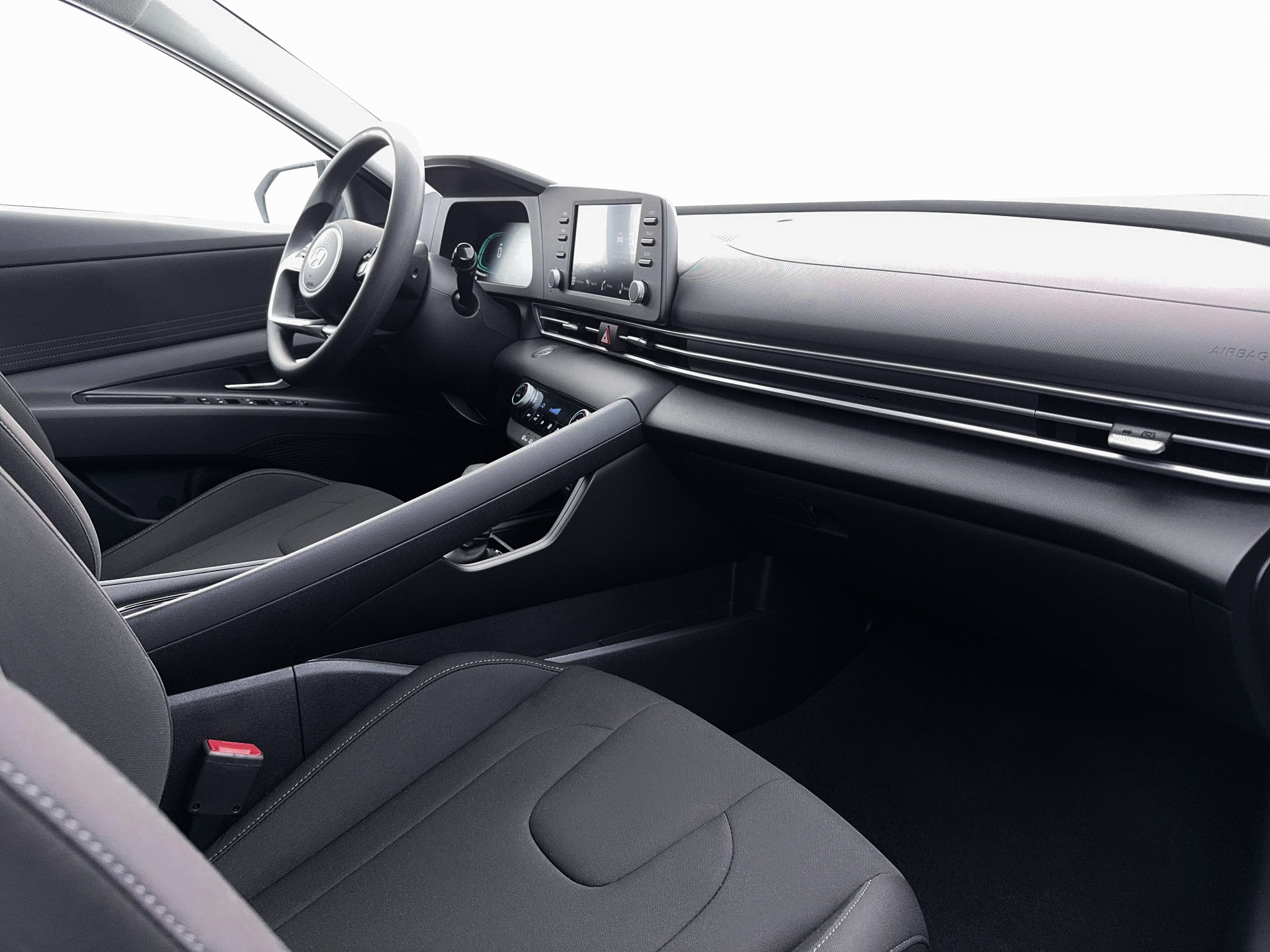 Elantra Hybrid Blue is nicely equipped with Option Group 01, Elantra Hybrid Blue, 4D Sedan, I4, 6-Speed Dual Clutch, FWD, Abyss Black, Black Cloth, 16 x 6.5J Alloy Wheels, 4-Wheel Disc Brakes, 6 Speakers, ABS brakes, Air Conditioning, Alloy wheels, AM/FM radio, Apple CarPlay & Android Auto, Auto High-beam Headlights, Automatic temperature control, Brake assist, Bumpers: body-color, Cargo Net, Cargo Side Bins, Cargo Tray, Carpeted Floor Mats, Delay-off headlights, Driver door bin, Driver vanity mirror, Dual front impact airbags, Dual front side impact airbags, Electronic Stability Control, Exterior Parking Camera Rear, First Aid Kit, Front anti-roll bar, Front Bucket Seats, Front Center Armrest, Front dual zone A/C, Front reading lights, Front wheel independent suspension, Fully automatic headlights, Heated door mirrors, Illuminated entry, Low tire pressure warning, Occupant sensing airbag, Outside temperature display, Overhead airbag, Overhead console, Panic alarm, Passenger door bin, Passenger vanity mirror, Power door mirrors, Power steering, Power windows, Premium Cloth Seat Trim, Radio: AM/FM/HD Display Audio, Rear Bumper Applique, Rear side impact airbag, Rear window defroster, Remote keyless entry, Security system, Speed control, Speed-sensing steering, Steering wheel mounted audio controls, Tachometer, Telescoping steering wheel, Tilt steering wheel, Traction control, Trip computer, and Variably intermittent wipers. FWD 6-Speed Dual Clutch I4