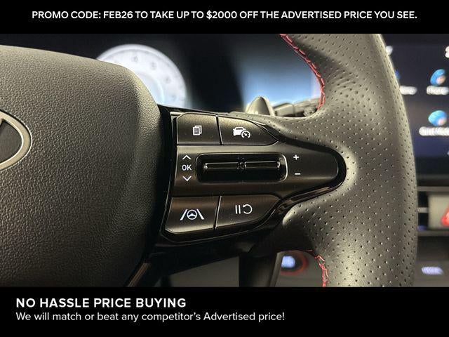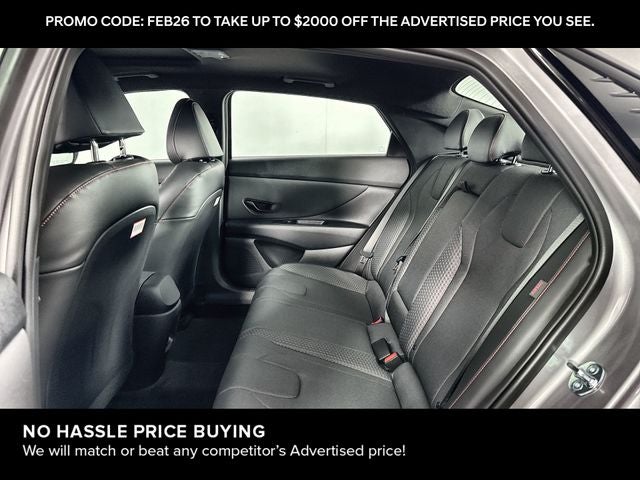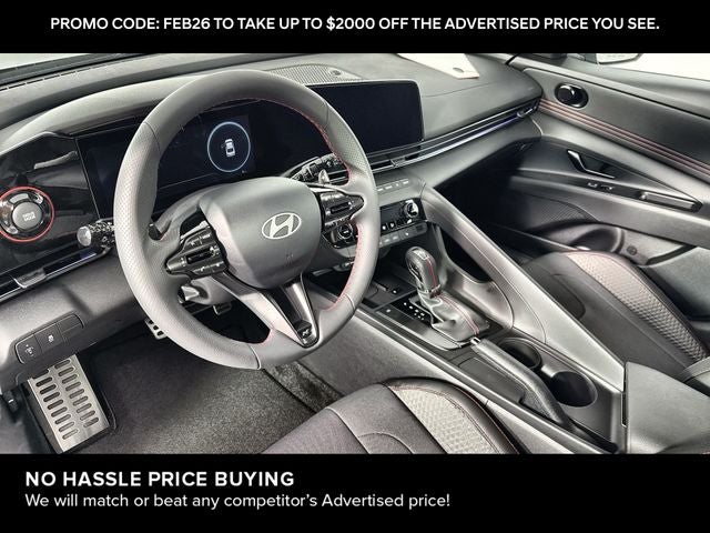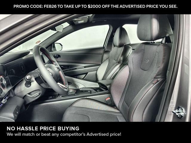 Elantra N Line is nicely equipped with Elantra N Line, 4D Sedan, I4, 7-Speed Dual Clutch DCT, FWD, Fluid Metal, Black Cloth, 4-Wheel Disc Brakes, 8 Speakers, ABS brakes, Air Conditioning, Alloy wheels, AM/FM radio: SiriusXM, Apple CarPlay & Android Auto, Auto High-beam Headlights, Automatic temperature control, Brake assist, Delay-off headlights, Driver door bin, Driver vanity mirror, Dual front impact airbags, Dual front side impact airbags, Electronic Stability Control, Exterior Parking Camera Rear, Four wheel independent suspension, Front anti-roll bar, Front Bucket Seats, Front dual zone A/C, Front reading lights, Fully automatic headlights, Heated door mirrors, Heated front seats, Illuminated entry, Leather Shift Knob, Leather steering wheel, Low tire pressure warning, Navigation System, Occupant sensing airbag, Outside temperature display, Overhead airbag, Overhead console, Panic alarm, Passenger door bin, Passenger vanity mirror, Power door mirrors, Power driver seat, Power moonroof, Power steering, Power windows, Rear anti-roll bar, Rear side impact airbag, Rear window defroster, Remote keyless entry, Security system, Speed control, Speed-sensing steering, Split folding rear seat, Spoiler, Sport steering wheel, Steering wheel mounted audio controls, Tachometer, Telescoping steering wheel, Tilt steering wheel, Traction control, Trip computer, Turn signal indicator mirrors, and Variably intermittent wipers. FWD 7-Speed Dual Clutch DCT I4