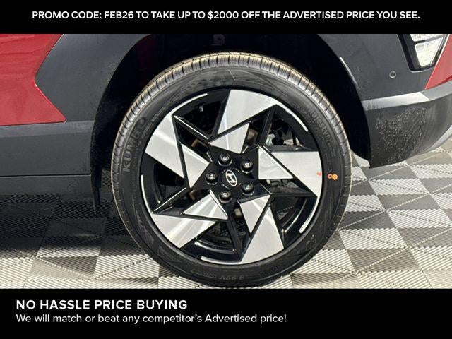 Kona Limited is nicely equipped with Option Group 01, Kona Limited, 4D Sport Utility, I4, 8-Speed Automatic, AWD, Ultimate Red Metallic, Black Premium Synthetic, 4-Wheel Disc Brakes, 8 Speakers, ABS brakes, Air Conditioning, All-Weather Fitted Liners, Alloy wheels, AM/FM radio: SiriusXM, Apple CarPlay & Android Auto, Auto High-beam Headlights, Auto-dimming Rear-View mirror, Automatic temperature control, Brake assist, Bumpers: body-color, Cargo Tray, Carpeted Floor Mats, Delay-off headlights, Driver door bin, Driver vanity mirror, Dual front impact airbags, Dual front side impact airbags, Electronic Stability Control, Emergency communication system: None, First Aid Kit, Four wheel independent suspension, Front anti-roll bar, Front Bucket Seats, Front Center Armrest, Front dual zone A/C, Front reading lights, Fully automatic headlights, H-Tex Seat Trim, Heated and Ventilated Front Bucket Seats, Heated door mirrors, Heated front seats, Heated steering wheel, Illuminated entry, Leather steering wheel, Low tire pressure warning, Navigation System, Occupant sensing airbag, Outside temperature display, Overhead airbag, Panic alarm, Passenger door bin, Passenger vanity mirror, Power door mirrors, Power driver seat, Power Liftgate, Power moonroof, Power steering, Power windows, Radio: AM/FM/SiriusXM/HD Audio System, Rear anti-roll bar, Rear seat center armrest, Rear window defroster, Rear window wiper, Remote keyless entry, Security system, Speed control, Speed-sensing steering, Split folding rear seat, Spoiler, Steering wheel mounted audio controls, Tachometer, Telescoping steering wheel, Tilt steering wheel, Traction control, Trip computer, Turn signal indicator mirrors, Variably intermittent wipers, Ventilated front seats, and Wheels: 19 x 7.5J Silver/Black Alloy. AWD 8-Speed Automatic I4