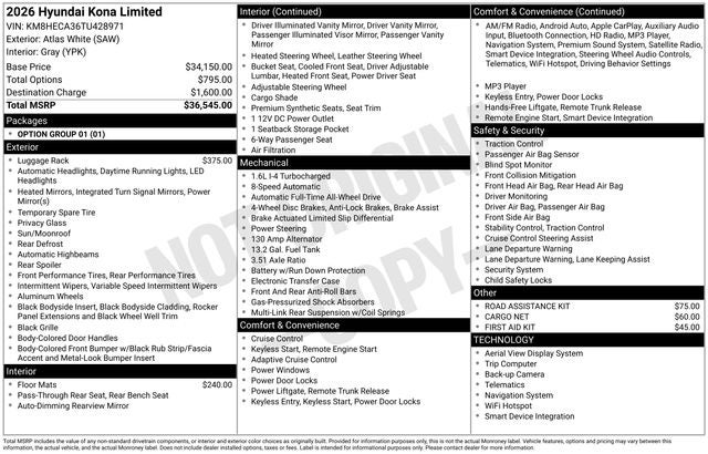 This 2026 Hyundai Kona Limited is a true gem, offering unparalleled value and an exceptional driving experience. Don't miss your chance to make this remarkable SUV your own. Visit our showroom today and let us demonstrate why the Kona Limited is the perfect choice for your next adventure. Price includes: $1000 - Hyundai HMF Dealer Choice : $1000 discount and 5.39% APR for 24 months. $44.05 per $1000 financed. Available to well qualified buyers who finance through Hyundai Motor Finance. H704. Exp. 03/31/2026 $750 - Sales Event Cash. Exp. 03/31/2026
