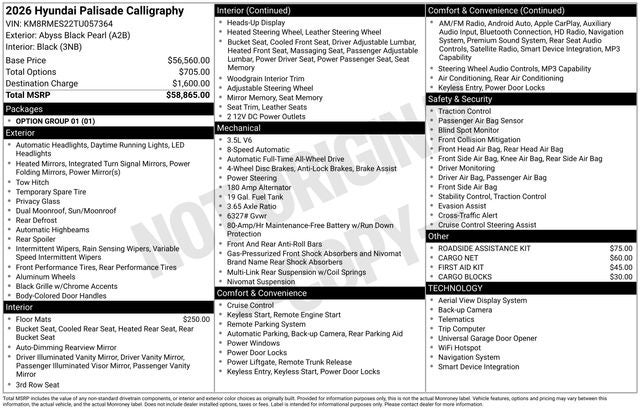 Palisade Calligraphy is nicely equipped with Option Group 01, Palisade Calligraphy, 4D Sport Utility, V6, 8-Speed Automatic, AWD, Abyss Black Pearl, Black Leather, 14 Speakers, 3rd row seats: split-bench, 4-Wheel Disc Brakes, ABS brakes, Air Conditioning, All-Season Fitted Liners, Alloy wheels, AM/FM radio: SiriusXM, Apple CarPlay & Android Auto, Audio memory, Auto High-beam Headlights, Auto-dimming door mirrors, Auto-dimming Rear-View mirror, Auto-leveling suspension, Automatic temperature control, Brake assist, Bumpers: body-color, Cargo Blocks, Cargo Net, Carpeted Floor Mats, Compass, Delay-off headlights, Driver door bin, Driver vanity mirror, Dual front impact airbags, Dual front side impact airbags, Electronic Stability Control, Exterior Parking Camera Rear, First Aid Kit, Four wheel independent suspension, Front anti-roll bar, Front Bucket Seats, Front Center Armrest, Front dual zone A/C, Front reading lights, Fully automatic headlights, Garage door transmitter: HomeLink, Genuine wood console insert, Genuine wood dashboard insert, Heads-Up Display, Heated door mirrors, Heated front seats, Heated rear seats, Heated steering wheel, HVAC memory, Illuminated entry, Knee airbag, Leather steering wheel, Low tire pressure warning, Memory seat, Navigation System, Occupant sensing airbag, Outside temperature display, Overhead airbag, Overhead console, Panic alarm, Passenger door bin, Passenger vanity mirror, Power door mirrors, Power driver seat, Power Liftgate, Power moonroof, Power passenger seat, Power steering, Power windows, Premium Nappa Leather Seat Trim, Radio data system, Radio: Infotainment Navigation System, Rain sensing wipers, Rear air conditioning, Rear anti-roll bar, Rear audio controls, Rear reading lights, Rear side impact airbag, Rear window defroster, Rear window wiper, Reclining 3rd row seat, Remote keyless entry, Roadside Assistance Kit, Security system, Speed control, Split folding rear seat, Spoiler, Steering wheel mounted audio controls, Tachometer, Telescoping steering wheel, Tilt steering wheel, Traction control, Trip computer, Turn signal indicator mirrors, Variably intermittent wipers, Ventilated front seats, Ventilated rear seats, and Wheels: 21 x 8.5J Alloy. AWD 8-Speed Automatic V6