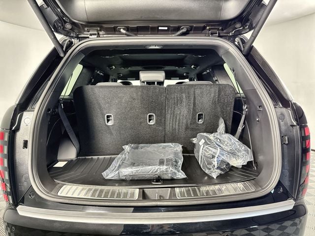 Palisade Calligraphy is nicely equipped with Option Group 01, Palisade Calligraphy, 4D Sport Utility, V6, 8-Speed Automatic, AWD, Abyss Black Pearl, Black Leather, 100W Charging Cable, 14 Speakers, 3rd row seats: split-bench, 4-Wheel Disc Brakes, ABS brakes, Air Conditioning, Alloy wheels, AM/FM radio: SiriusXM, Apple CarPlay & Android Auto, Audio memory, Auto High-beam Headlights, Auto-dimming door mirrors, Auto-dimming Rear-View mirror, Auto-leveling suspension, Automatic temperature control, Brake assist, Bumpers: body-color, Cargo Net, Cargo Organizer, Cargo Tray, Carpeted Floor Mats, Compass, Delay-off headlights, Door Panel Protector, Driver door bin, Driver vanity mirror, Dual front impact airbags, Dual front side impact airbags, Electronic Stability Control, Exterior Parking Camera Rear, First Aid Kit, Four wheel independent suspension, Front anti-roll bar, Front Bucket Seats, Front Center Armrest, Front dual zone A/C, Front reading lights, Fully automatic headlights, Garage door transmitter: HomeLink, Genuine wood console insert, Genuine wood dashboard insert, Heads-Up Display, Heated door mirrors, Heated front seats, Heated rear seats, Heated steering wheel, HVAC memory, Illuminated entry, Knee airbag, Leather steering wheel, Low tire pressure warning, Memory seat, Navigation System, Occupant sensing airbag, Outside temperature display, Overhead airbag, Overhead console, Panic alarm, Passenger door bin, Passenger vanity mirror, Power door mirrors, Power driver seat, Power Liftgate, Power moonroof, Power passenger seat, Power steering, Power windows, Premium Nappa Leather Seat Trim, Radio data system, Radio: Infotainment Navigation System, Rain sensing wipers, Rear air conditioning, Rear anti-roll bar, Rear audio controls, Rear reading lights, Rear side impact airbag, Rear window defroster, Rear window wiper, Reclining 3rd row seat, Remote keyless entry, Security system, Severe Weather Kit, Speed control, Split folding rear seat, Spoiler, Steering wheel mounted audio controls, Tachometer, Telescoping steering wheel, Tilt steering wheel, Traction control, Trip computer, Turn signal indicator mirrors, Variably intermittent wipers, Ventilated front seats, Ventilated rear seats, and Wheels: 21 x 8.5J Alloy. AWD 8-Speed Automatic V6