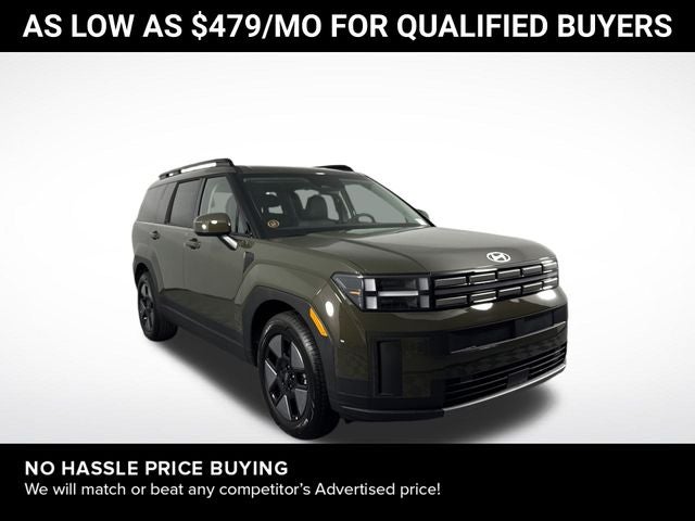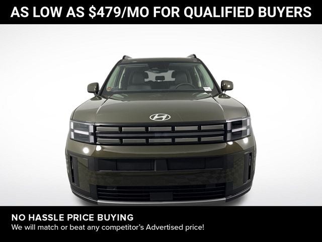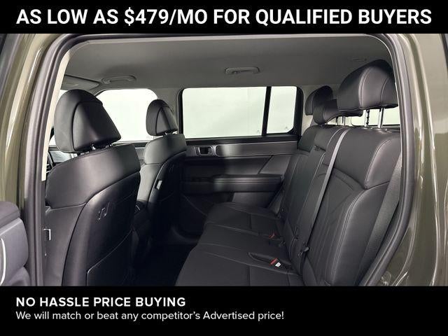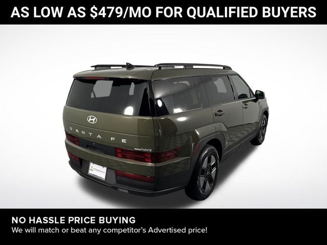 Santa Fe Hybrid SEL is nicely equipped with Option Group 01, Santa Fe Hybrid SEL, 4D Sport Utility, I4, 6-Speed Automatic with Shiftronic, AWD, Rockwood Green, Black Premium Synthetic, 18 x 7.5J Alloy Wheels, 3rd row seats: bench, 4-Wheel Disc Brakes, 6 Speakers, ABS brakes, Air Conditioning, Alloy wheels, AM/FM radio: SiriusXM, Apple CarPlay & Android Auto, Auto High-beam Headlights, Automatic temperature control, Brake assist, Bumpers: body-color, Carpeted Floor Mats, Delay-off headlights, Driver door bin, Driver vanity mirror, Dual front impact airbags, Dual front side impact airbags, Electronic Stability Control, Emergency communication system, Exterior Parking Camera Rear, Four wheel independent suspension, Front anti-roll bar, Front Bucket Seats, Front Center Armrest, Front dual zone A/C, Front reading lights, Fully automatic headlights, H-Tex Leatherette Seat Trim, Heated door mirrors, Heated Front Bucket Seats, Heated front seats, Illuminated entry, Knee airbag, Leather steering wheel, Low tire pressure warning, Occupant sensing airbag, Outside temperature display, Overhead airbag, Overhead console, Panic alarm, Passenger door bin, Passenger vanity mirror, Power door mirrors, Power driver seat, Power Liftgate, Power steering, Power windows, Radio: AM/FM/HD Display Audio, Rear anti-roll bar, Rear seat center armrest, Rear side impact airbag, Rear window defroster, Rear window wiper, Remote keyless entry, Security system, Speed control, Speed-sensing steering, Split folding rear seat, Spoiler, Steering wheel mounted audio controls, Tachometer, Telescoping steering wheel, Tilt steering wheel, Traction control, Trip computer, Turn signal indicator mirrors, and Variably intermittent wipers. AWD 6-Speed Automatic with Shiftronic I4