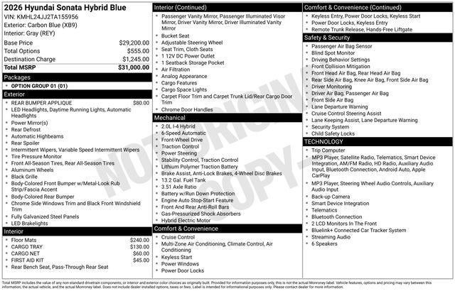 $730 off MSRP! Carbon Blue 2026 Hyundai Sonata Hybrid Blue Back up Camera, Best place to buy a used car, Bluetooth®, Buy a used car, New Hyundai dealership near me, New Hyundai for sale near me, Used car deals this weekend, Used car for sale, Used car special, Used car specials, Used cars near Indianapolis, Used cars near me, Sonata Hybrid Blue, 4D Sedan, I4, 6-Speed Automatic with Shiftronic, FWD, Carbon Blue, Gray Cloth.