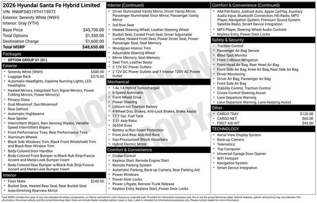 Santa Fe Hybrid Limited is nicely equipped with Option Group 01, Santa Fe Hybrid Limited, 4D Sport Utility, I4, 6-Speed Automatic with Shiftronic, FWD, Serenity White, Gray Leather, 12 Speakers, 3rd row seats: bench, 4-Wheel Disc Brakes, ABS brakes, Air Conditioning, Alloy wheels, AM/FM radio: SiriusXM, Apple CarPlay & Android Auto, Auto High-beam Headlights, Auto-dimming Rear-View mirror, Automatic temperature control, Brake assist, Bumpers: body-color, Cargo Net, Cargo Tray, Carpeted Floor Mats, Delay-off headlights, Driver door bin, Driver vanity mirror, Dual front impact airbags, Dual front side impact airbags, Electronic Stability Control, Emergency communication system, Exterior Parking Camera Rear, First Aid Kit, Four wheel independent suspension, Front anti-roll bar, Front Bucket Seats, Front Center Armrest, Front dual zone A/C, Front reading lights, Fully automatic headlights, Garage door transmitter: HomeLink, Heated and Ventilated Front Bucket Seats, Heated door mirrors, Heated front seats, Heated rear seats, Heated steering wheel, Illuminated entry, Knee airbag, Leather Seat Trim, Leather steering wheel, Low tire pressure warning, Memory seat, Navigation System, Occupant sensing airbag, Outside temperature display, Overhead airbag, Overhead console, Panic alarm, Passenger door bin, Passenger vanity mirror, Power door mirrors, Power driver seat, Power Liftgate, Power moonroof, Power passenger seat, Power steering, Power windows, Radio: AM/FM/HD Bose Premium Audio System, Rain sensing wipers, Rear anti-roll bar, Rear side impact airbag, Rear window defroster, Rear window wiper, Remote keyless entry, Roof Rack Crossbars, Security system, Speed control, Speed-sensing steering, Split folding rear seat, Spoiler, Steering wheel mounted audio controls, Tachometer, Telescoping steering wheel, Tilt steering wheel, Traction control, Trip computer, Turn signal indicator mirrors, Variably intermittent wipers, Ventilated front seats, and Wheels: 20 x 8.5J Alloy. FWD 6-Speed Automatic with Shiftronic I4