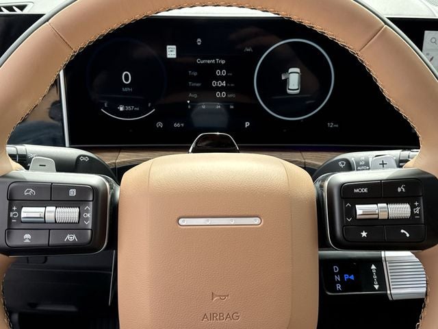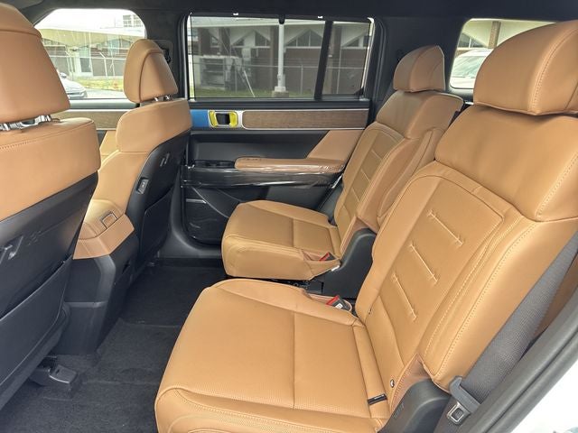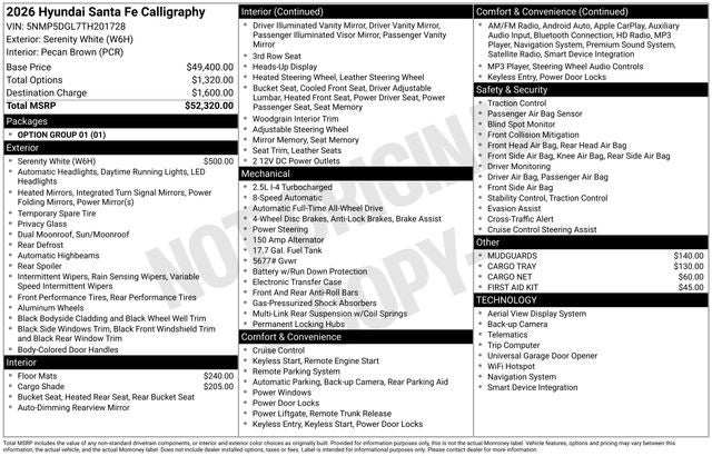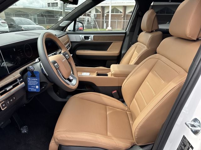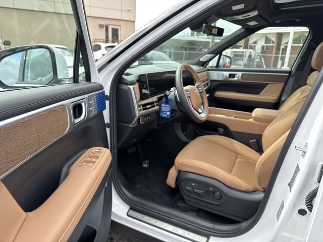 Santa Fe Calligraphy is nicely equipped with Option Group 01, Santa Fe Calligraphy, 4D Sport Utility, 2.5L I4, 8-Speed Automatic with SHIFTRONIC, AWD, Serenity White, Pecan Brown Leather, 12 Speakers, 3rd row seats: bench, 4-Wheel Disc Brakes, ABS brakes, Air Conditioning, Alloy wheels, AM/FM radio: SiriusXM, Apple CarPlay & Android Auto, Auto High-beam Headlights, Auto-dimming Rear-View mirror, Automatic temperature control, Brake assist, Bumpers: body-color, Cargo Cover/Screen, Cargo Net, Cargo Tray, Carpeted Floor Mats, Delay-off headlights, Driver door bin, Driver vanity mirror, Dual front impact airbags, Dual front side impact airbags, Electronic Stability Control, Emergency communication system, Exterior Parking Camera Rear, First Aid Kit, Four wheel independent suspension, Front anti-roll bar, Front Bucket Seats, Front Center Armrest, Front dual zone A/C, Front reading lights, Fully automatic headlights, Garage door transmitter: HomeLink, Heads-Up Display, Heated and Ventilated Front Bucket Seats, Heated door mirrors, Heated front seats, Heated rear seats, Heated steering wheel, Illuminated entry, Knee airbag, Leather steering wheel, Low tire pressure warning, Memory seat, Mudguards, Navigation System, Occupant sensing airbag, Outside temperature display, Overhead airbag, Overhead console, Panic alarm, Passenger door bin, Passenger vanity mirror, Power door mirrors, Power driver seat, Power Liftgate, Power moonroof, Power passenger seat, Power steering, Power windows, Quilted Premium Nappa Leather Seat Trim, Radio: AM/FM/HD Bose Premium Audio System, Rain sensing wipers, Rear anti-roll bar, Rear side impact airbag, Rear window defroster, Rear window wiper, Remote keyless entry, Security system, Speed control, Speed-sensing steering, Split folding rear seat, Spoiler, Steering wheel mounted audio controls, Tachometer, Telescoping steering wheel, Tilt steering wheel, Traction control, Trip computer, Turn signal indicator mirrors, Variably intermittent wipers, Ventilated front seats, and Wheels: 21 x 8.5J Unique Dark Finish Alloy. AWD 8-Speed Automatic with SHIFTRONIC 2.5L I4