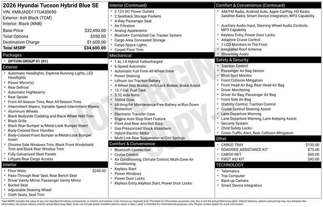 Tucson Hybrid Blue is nicely equipped with Option Group 01, Tucson Hybrid Blue, 4D Sport Utility, 1.6L I4 DGI Hybrid Turbocharged DOHC 16V LEV3-SULEV30, 6-Speed Automatic, AWD, Ash Black, Black Cloth, 17 x 7.0J Alloy Wheels, 4-Wheel Disc Brakes, 6 Speakers, ABS brakes, Air Conditioning, Alloy wheels, AM/FM radio: SiriusXM, Apple CarPlay & Android Auto, Auto High-beam Headlights, Automatic temperature control, Brake assist, Bumpers: body-color, Cargo Net, Cargo Tray, Carpeted Floor Mats, Delay-off headlights, Driver door bin, Driver vanity mirror, Dual front impact airbags, Dual front side impact airbags, Electronic Stability Control, First Aid Kit, Four wheel independent suspension, Front anti-roll bar, Front Bucket Seats, Front Center Armrest, Front dual zone A/C, Front reading lights, Fully automatic headlights, Illuminated entry, Low tire pressure warning, Occupant sensing airbag, Outside temperature display, Overhead airbag, Overhead console, Panic alarm, Passenger door bin, Passenger vanity mirror, Power door mirrors, Power steering, Power windows, Radio data system, Radio: AM/FM/HD Audio System, Rear anti-roll bar, Rear reading lights, Rear seat center armrest, Rear side impact airbag, Rear window defroster, Rear window wiper, Remote keyless entry, Roadside Assistance Kit, Security system, Speed control, Split folding rear seat, Spoiler, Steering wheel mounted audio controls, Tachometer, Telescoping steering wheel, Tilt steering wheel, Traction control, Trip computer, and Variably intermittent wipers. AWD 6-Speed Automatic 1.6L I4 DGI Hybrid Turbocharged DOHC 16V LEV3-SULEV30