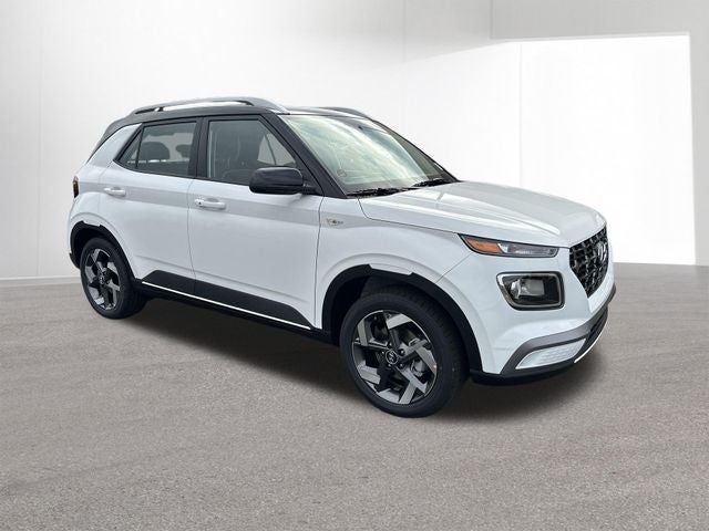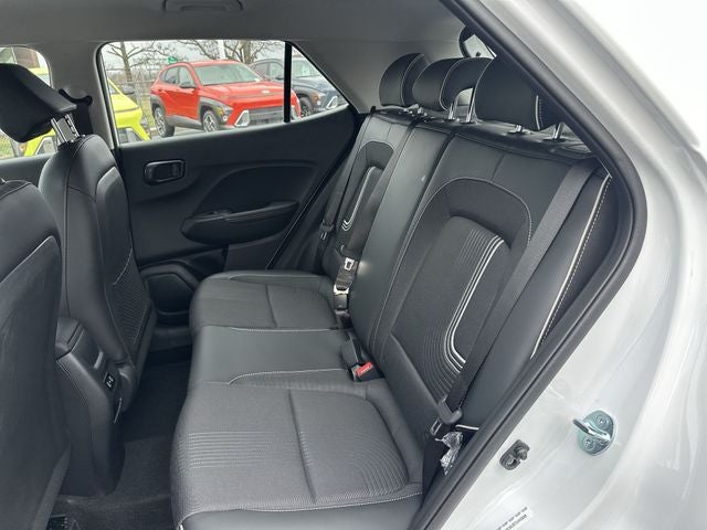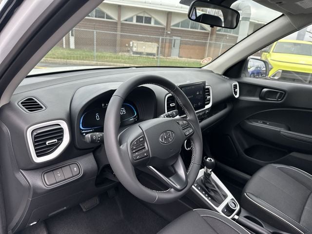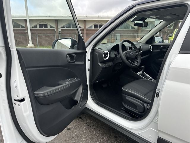 Venue SEL is nicely equipped with Option Group 01, Venue SEL, 4D Sport Utility, I4, CVT, FWD, Lunar White w/Black Roof, Black Cloth, 4-Wheel Disc Brakes, 6 Speakers, 6.5J x 17 Alloy Wheels, ABS brakes, Air Conditioning, Alloy wheels, AM/FM radio, Apple CarPlay & Android Auto, Auto High-beam Headlights, Automatic temperature control, Brake assist, Bumpers: body-color, Cargo Net, Cargo Tray, Carpeted Floor Mats, Cloth/H-Tex Combination Seat Trim, Delay-off headlights, Driver door bin, Driver vanity mirror, Dual front impact airbags, Dual front side impact airbags, Electronic Stability Control, First Aid Kit, Front anti-roll bar, Front Bucket Seats, Front Center Armrest, Front reading lights, Front wheel independent suspension, Fully automatic headlights, Heated door mirrors, Heated Front Bucket Seats, Heated front seats, Illuminated entry, Leather Shift Knob, Leather steering wheel, Low tire pressure warning, Occupant sensing airbag, Outside temperature display, Overhead airbag, Overhead console, Panic alarm, Passenger door bin, Passenger vanity mirror, Power door mirrors, Power steering, Power windows, Radio: AM/FM/HD Display Audio, Rear Seat Cup Holder, Rear window defroster, Rear window wiper, Remote keyless entry, Roadside Assistance Kit, Security system, Speed control, Speed-sensing steering, Split folding rear seat, Spoiler, Steering wheel mounted audio controls, Tachometer, Telescoping steering wheel, Tilt steering wheel, Traction control, Trip computer, and Variably intermittent wipers. FWD CVT I4