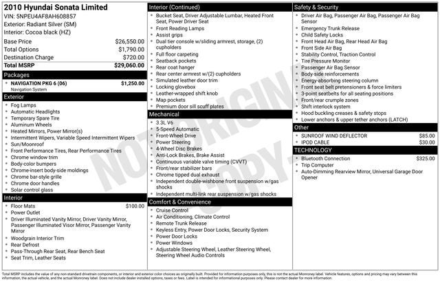 Clean CARFAX. Radiant Silver Metallic 2010 Hyundai Sonata FWD Limited 3.3L V6 DOHC 24V