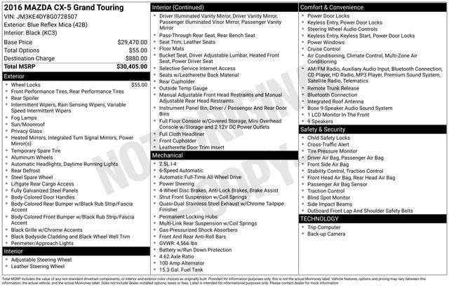 Clean CARFAX. Blue Reflex Mica 2016 Mazda CX-5 AWD Grand Touring SKYACTIV® 2.5L 4-Cylinder DOHC 16V
