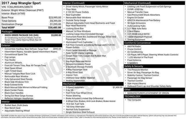 Priced below KBB Fair Purchase Price! Clean CARFAX. Bright White Clearcoat 2017 Jeep Wrangler 4WD Sport 3.6L V6 24V VVT