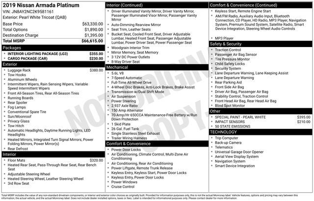 Pearl White Tricoat 2019 Nissan Armada 4WD Platinum 5.6L V8 DOHC 32V Endurance