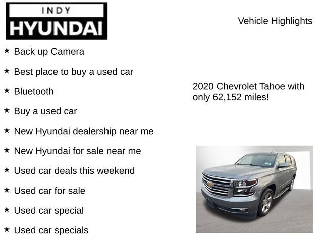 Recent Arrival! Back up Camera, Best place to buy a used car, Bluetooth®, Buy a used car, New Hyundai dealership near me, New Hyundai for sale near me, Used car deals this weekend, Used car for sale, Used car special, Used car specials, Used cars near Indianapolis, Used cars near me, Tahoe Premier, 4D Sport Utility, EcoTec3 5.3L V8, 6-Speed Automatic Electronic with Overdrive, 4WD, Satin Steel Metallic, Jet Black Leather.