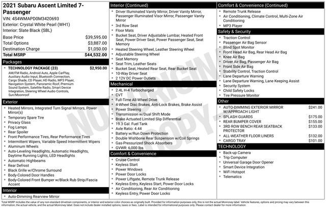 CARFAX One-Owner. Crystal White Pearl 2021 Subaru Ascent AWD Limited 2.4L 4-Cylinder DOHC 16V