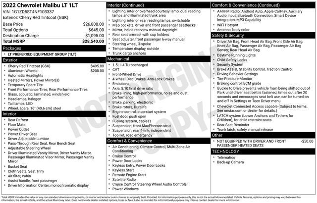 Cherry Red Tintcoat 2022 Chevrolet Malibu FWD LT 1.5L DOHC