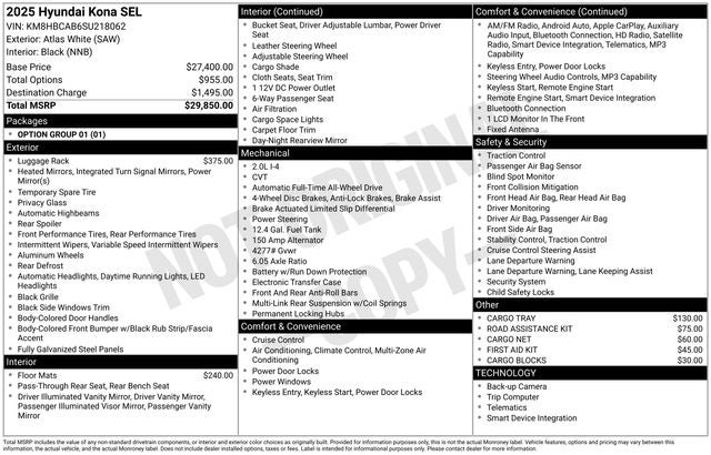 This online window sticker is provided for informational purposes only. Vehicle features, options, pricing and other information are subject to change. See your Hyundai dealer and the Monroney label affixed to the actual vehicle for the most up-to-date specifications and information.